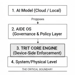 TRIT CORE operates at the irreversible boundary. No cloud-based intelligence can directly execute actions without passing through this bounded, device-level gate.